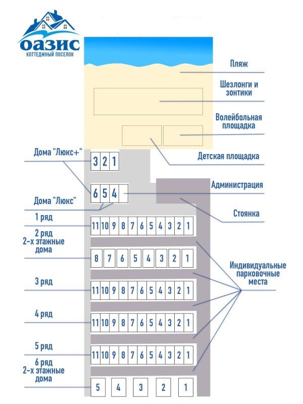 Размещение: Шесть рядов коттеджей, из них четыре одноэтажные и два дуплекс.