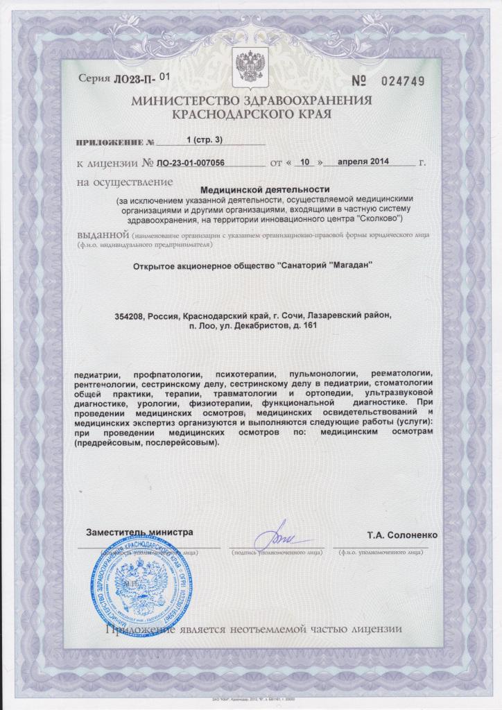 Санаторий "Магадан" специализируется на лечении и оздоровлении по таким профилям: гинекологические заболевания, сердечно-сосудистая система (система кровообращения), болезни нервной системы, болезни органов дыхания, болезни костно-мышечной системы (опорно-двигательного аппарата).