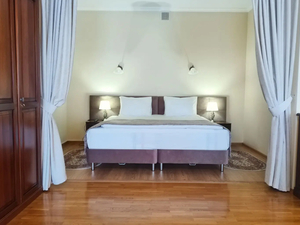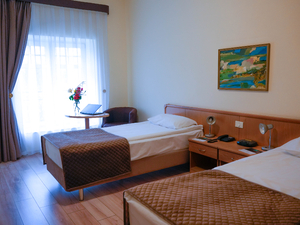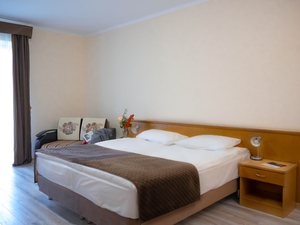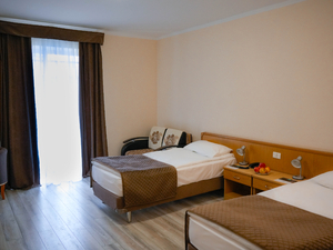 Сервис: Уборка номера ежедневно, смена белья - раз в 6 дней, смена полотенец - раз в 3 дня, смена белья – раз в 6 дней (в номерах «стандарт» и «комфорт»), раз в 3 дня (в люксах, апартаментах и сьютах), смена полотенец - раз в 3 дня (в номерах «стандарт» и «комфорт»), ежедневно (в люксах, апартаментах, сьютах).2-местный стандарт (макс. 2+1 чел., 25 кв. м, телевизор, кондиционер, душ/ванна, фен, халаты, тапочки, холодильник, сейф, телефон, мягкая мебель, 1-спальные/ 2-спальная кровать, чайник, набор посуды, французский балкон, санузел). Доп. место - еврораскладушка/диван, может быть установлен без ограничения по возрасту.2-местный комфорт (макс. 2+2 чел., 30 кв. м, телевизор, душ/ванна, биде, фен, халаты, тапочки, холодильник, сейф, телефон, 1-спальные/ 2-спальная кровать, чайник, набор посуды, французский балкон, санузел). Доп. место - еврораскладушка/диван, может быть установлен без ограничения по возрасту.2-местный полулюкс (макс. 2+2 чел., 35 кв. м, телевизор, душ/ванна, фен, халаты, тапочки, холодильник, сейф, телефон, 1-спальные/ 2-спальная кровать, чайник, набор посуды, французский балкон, санузел). Доп. место - еврораскладушка/диван, может быть установлен без ограничения по возрасту.2-местный 2-комнатный люкс (макс. 2+2 чел., 60 кв. м, телевизор, кондиционер, душ/ванна, фен, халаты, тапочки, холодильник, кухня/мини-кухня, сейф, телефон, 1-спальные/ 2-спальная кровать, диван, чайник, набор посуды, французский балкон, санузел, кухня (плита, посуда, столовые приборы)). Доп. место - диван, при размещении 4 человек третий и четвертый туристы размещаются на 2-спальном диване.2-местный 1-комнатный апартамент-студио (макс. 2+2 чел., 90 кв. м, телевизор, кондиционер, душ/ванна, биде, фен, халаты, тапочки, холодильник, сейф, телефон, 2-спальная кровать, диван, обеденный стол, чайник, набор посуды, французский балкон, санузел, есть номера коннект с 1но местными номером "комфорт"). Доп. место - диван, при размещении 4 человек третий и четвертый туристы размещаются на 2-спальном диване.2-местный 2-комнатный апартамент (макс. 2+2 чел., 90 кв. м, телевизор, кондиционер, душ/ванна, биде, фен, халаты, тапочки, холодильник, сейф, телефон, 2-спальная кровать, диван, обеденный стол, чайник, набор посуды, французский балкон, санузел, 2 ванные комнаты, есть номера коннект с 1но местными номером "комфорт"). Доп. место - диван, при размещении 4 человек третий и четвертый туристы размещаются на 2-спальном диване.