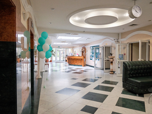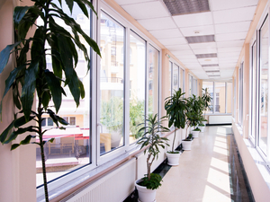 Размещение: Один 5-этажный спальный корпус, соединенный переходами с 3-этажным лечебно-диагностическим корпусом, столовой и бассейном.