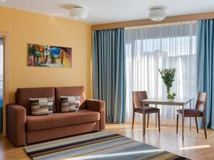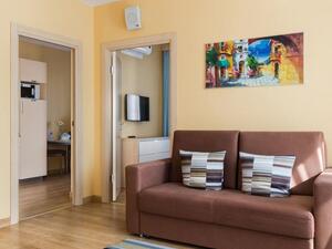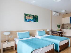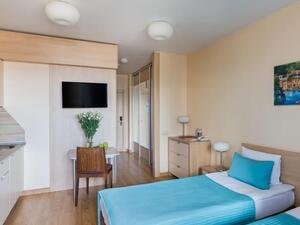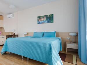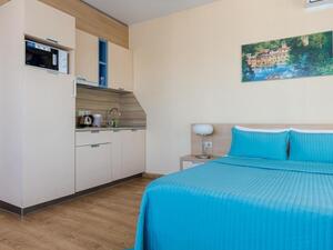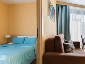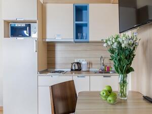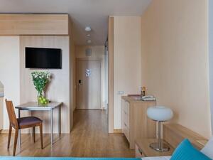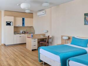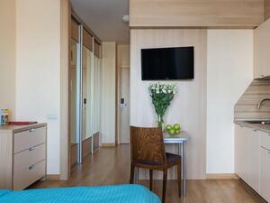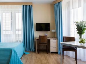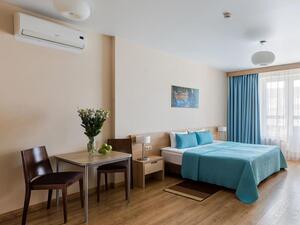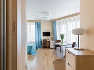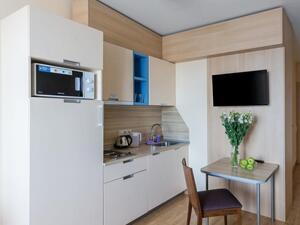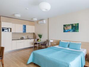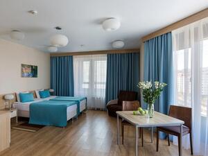 Студия Стандарт одноместная (макс. 1 чел., 26 кв. м, Wi-Fi, кондиционер, фен, тапочки, холодильник, кухня/мини-кухня, микроволновая печь, сейф, телефон, 1-спальная кровать, обеденный стол, шкаф, чайник, душевая кабина, набор посуды, стулья, письменный стол, плита).Студия Стандарт с двумя односпальными кроватями (макс. 2 чел., 26 кв. м, Wi-Fi, кондиционер, фен, холодильник, кухня/мини-кухня, микроволновая печь, сейф, телефон, 1,5-спальные кровати, обеденный стол, шкаф, чайник, набор посуды, стулья, письменный стол, плита, приятные светлые апартаменты площадью 26 кв. м, предназначенные как под одноместное (SNG), так и двухместное размещение (TWIN). Отличный вариант для длительного или краткосрочного проживания).Студия Стандарт с одной двуспальной кроватью (макс. 2 чел., 26 кв. м, Wi-Fi, кондиционер, фен, холодильник, кухня/мини-кухня, микроволновая печь, сейф, телефон, 2-спальная кровать, обеденный стол, чайник, набор посуды, стулья, письменный стол, плита, приятные светлые апартаменты площадью 26 кв. м, предназначенные как под одноместное (SNG), так и двухместное размещение (TWIN). Отличный вариант для длительного или краткосрочного проживания).Студия Комфорт (макс. 2+1 чел., 32 кв. м, Wi-Fi, кондиционер, фен, тапочки, холодильник, кухня/мини-кухня, микроволновая печь, сейф, телефон, стул, 2-спальная кровать, обеденный стол, шкаф, чайник, письменный стол, плита, уютный светлый номер с большими панорамными окнами (32 кв. м). Номер позволяет комфортно разместиться семье из 3-х человек, так как в номере помимо двуспальной кровати располагается удобное раскладывающееся кресло).Бизнес Стандарт с двумя односпальными кроватями (макс. 2 чел., 38 кв. м, Wi-Fi, кондиционер, фен, тапочки, холодильник, кухня/мини-кухня, микроволновая печь, сейф, телефон, стул, 1,5-спальные кровати, обеденный стол, кресло-кровать, шкаф, чайник, набор посуды, плита, просторные апартаменты (38 кв. м) подойдут как для деловых поездок, так и для отдыха с семьей. Для вашего удобства в номере установлен мягкий диван 120 см шириной, который может служить дополнительным местом).Бизнес Стандарт с двуспальной кроватью (макс. 2 чел., 38 кв. м, Wi-Fi, кондиционер, фен, тапочки, холодильник, кухня/мини-кухня, микроволновая печь, сейф, телефон, 2-спальная кровать, обеденный стол, шкаф, чайник, набор посуды, стулья, письменный стол, плита, просторные апартаменты (38 кв. м) подойдут как для деловых поездок, так и для отдыха с семьей. Для вашего удобства в номере установлен мягкий диван 120 см шириной, который может служить дополнительным местом).Бизнес Комфорт (макс. 2 чел., 47 кв. м, Wi-Fi, кондиционер, душ, фен, тапочки, холодильник, кухня/мини-кухня, микроволновая печь, сейф, телефон, стул, 1,5-спальные/ 2-спальная кровать, обеденный стол, кресло-кровать, шкаф, чайник, набор посуды, письменный стол, плита, удобный номер с большими панорамными эркерными окнами (47 кв. м), позволяющий с комфортом разместиться как отдыхающим, так и деловым людям. Для удобства в номере расположено раскладывающееся кресло, которое может служить дополнительным местом).ДеЛюкс (макс. 4 чел., 80 кв. м, Wi-Fi, кондиционер, фен, тапочки, холодильник, кухня/мини-кухня, микроволновая печь, сейф, телефон, 2-спальная кровать, 1,5-спальные кровати, обеденный стол, чайник, набор посуды, стулья, плита, раскладной диван, гардеробная, большой четырехместный двухкомнатный номер с кухней-гостиной, отдельной гардеробной и просто