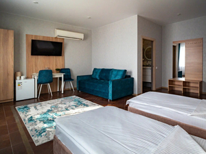 3-местный стандарт с диваном (макс. 3+1 чел., 25 кв. м, ЖК/LCD телевизор, фен, тапочки, холодильник, электрочайник, 2-спальная кровать, диван, душевая кабина, санузел). Доп. место - раскладной диван, можно установить для ребенка с 4 до 12 лет. при размещении 4 человек третий и четвертый туристы размещаются на раскладном диване.