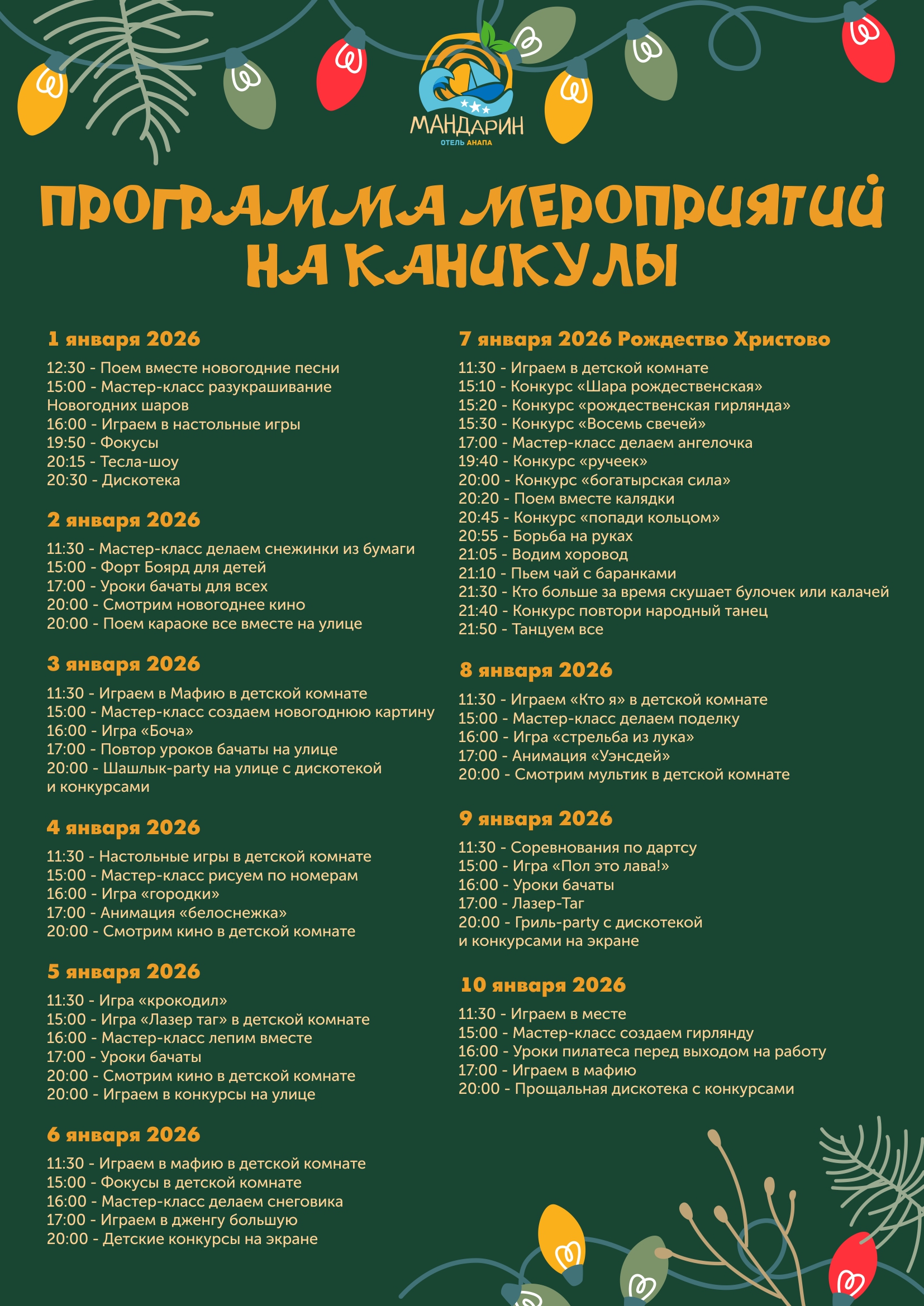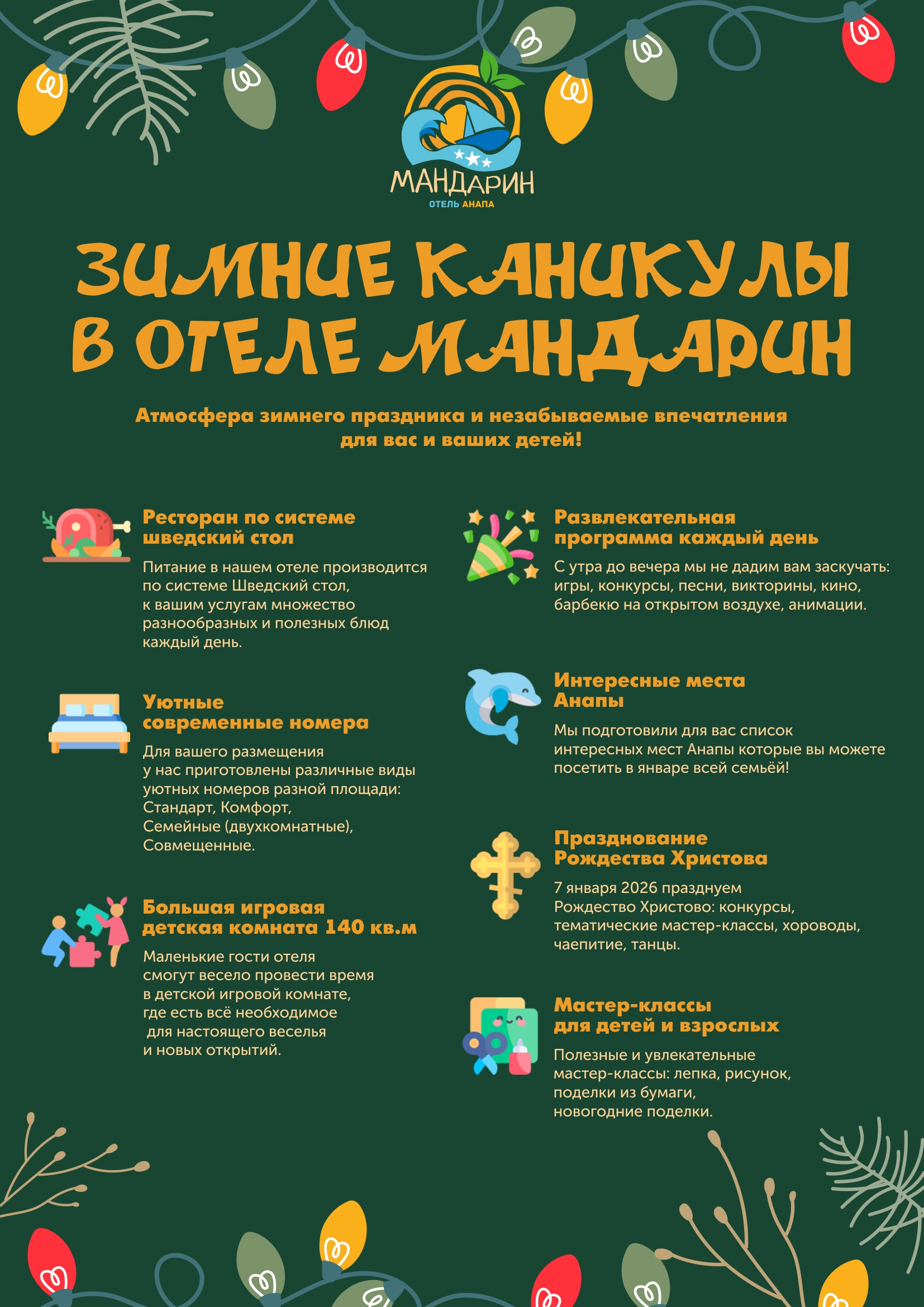 Услуги для детей: детский открытый бассейн (подогреваемый, работает до 04.11). Бесплатно: батут, ванночка для купания (, табурет, стульчик для кормления-по запросу), детская анимация (работает до 30.09; (ежедневно с 26.10 по 01.11.25 вкл. с 11.00 до 12.00 в ресторане отеля:1. Приготовление вкуснейших роллов с разными начинками 2. Создание шедевральных мини-тортиков 3. Приготовление неповторимой гжанки (сэндвича) с разными начинками 4. Венские вафли с различными топингами 5. Создание канапе и тарталеток своими руками 6. Сладкий стол своими руками (готовим десерты/ печенье/ пряники) 7. Приготовление пиццы "4 сезона" ). ), детская игровая комната (в зимний период работает с 31.12.25 по 11.01.26), детская площадка. Платно: детская кроватка (400 руб. в сутки), прокат детских колясок (от 100-700 руб в зависимости от времени аренды)