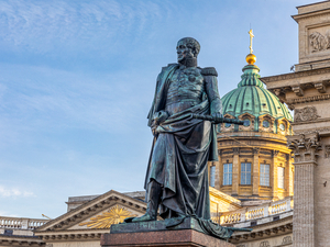 Самое крупное архитектурное сооружение Петергофского ансамбля - Большой дворец. Он занимает доминирующее положение в композиции парка и как бы венчает собой Большой каскад. Изящное здание в три этажа с галереями, со сверкающими позолотой куполов замыкающими его корпусами - "Церковным" и "Корпусом под гербом" - протянулось своим фасадом вдоль террасы почти на 300 метров.