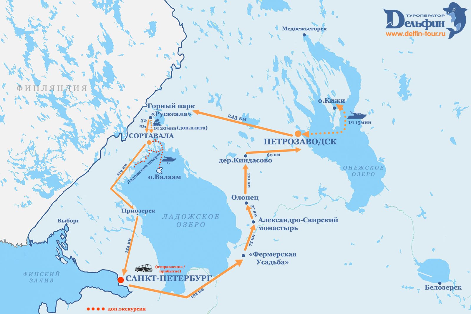 Карта тура "4 сочных дня в Карелии. Рускеала, водопады, шхеры, Кижи", автобусный тур на 4 дня из Санкт-Петербурга в Карелию