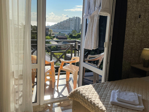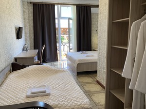 Сервис: Уборка номера ежедневно, смена полотенец - раз в 4 дня2-местный стандарт с балконом (макс. 2+1 чел., 25 кв. м, телевизор, кондиционер, душ, халаты, тапочки, балкон, сейф, 1-спальные/ 2-спальная кровать, мини-холодильник, 5-ый этаж). Доп. место - раскладушка/раскладное кресло.2-местный видовой стандарт с балконом (макс. 2+1 чел., 25 кв. м, телевизор, кондиционер, душ, халаты, тапочки, балкон, сейф, 1-спальные/ 2-спальная кровать, мини-холодильник, 6-ой этаж). Доп. место - раскладушка/раскладное кресло.3-местный семейный с балконом, вид во двор (макс. 3+1 чел., 25 кв. м, телевизор, кондиционер, душ/ванна, халаты, тапочки, балкон, сейф, 2-спальная кровать, диван, мини-холодильник, 2-3 этаж, вид во двор на соседнее здание). Доп. место - еврораскладушка.3-местный семейный с балконом (макс. 3+1 чел., 25 кв. м, телевизор, кондиционер, душ/ванна, халаты, тапочки, балкон, сейф, 2-спальная кровать, диван, мини-холодильник, 2-4 этажи, вид на горы или на бассейн). Доп. место - еврораскладушка.
