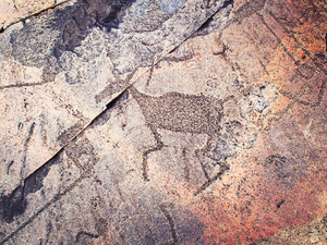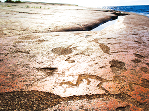 После обеда едем к цели нашего путешествия - в местечко Залавруга недалеко от г. Беломорска. Именно здесь, на островах реки Выг, находятся Беломорские Петроглифы. Наскальные изображения, возраст которых не менее 4,5-5,5 тысяч лет, внесены в Список всемирного наследия ЮНЕСКО. Под рассказы гида посмотрим выбитые в камне фигуры людей, животных, рыб, сцены охоты, войны и ритуальных шествий.