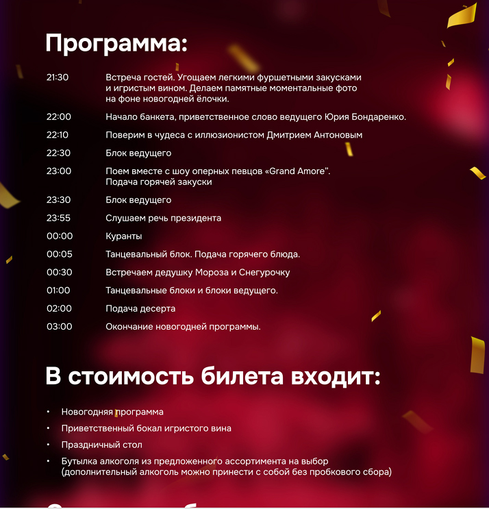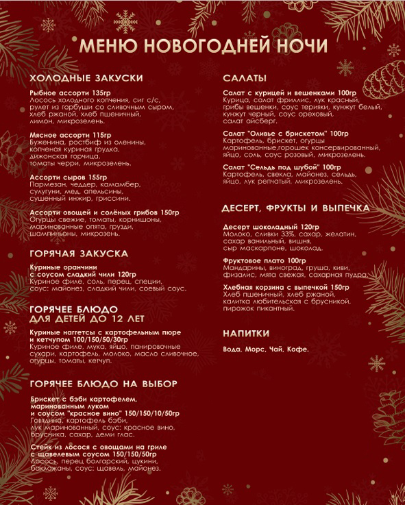 взрослый тариф - от 18 лет (включая меню, новогоднюю программу и алкоголь (1 бутылка на человека))